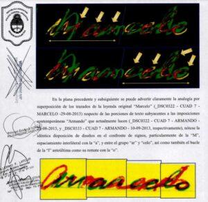 Realizado por la División Scopometría de la Superintendencia de Policía Científica de la Policía Federal, el peritaje demostró que los cuadernos sobre los cuales el fiscal Carlos Stornelli y el juez Claudio Bonadío montaron un estridente show mediático fueron adulterados por cuatro manos aparte de la del militar, y que mientras las primeras anotaciones pueden corresponder al registro de los lugares de cada viaje que hizo como chofer, las posteriores están hechas a mayor velocidad, con distinta inclinación y en forma continua, lo cual es compatible con el dictado. Ese es el tramo en el que se habla de bolsos y dinero.