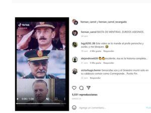 Por otro lado, Carrol comparte actividades con los revolufederales de Morel y finalmente con los detenidos por el magnicidio, Fernando Sabag Montiel y Brenda Uliarte. Y en la página de su Nueva Centro Derecha también publica insultos a los que llama zurdos e imágenes de los jefes de la última dictadura: