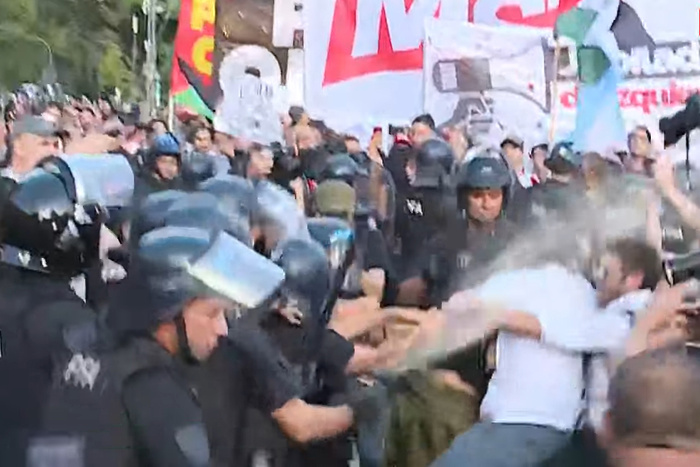 Un megaoperativo de la Policía Federal y la Gendarmería, que duplicaba a los manifestantes, avanzó con escudos, bastones y gases lacrimógenos contra los jubilados y las postas de salud y seguridad que acompañan el reclamo. «¡Que todo el mundo escuche y entienda bien! ¡Es un gobierno dictatorial! ¡Este gobieron no da más!», se descargó un jubilado con los ojos rojos tras ser gaseado por el operativo antipiquetes de la ministra de Seguridad, Patricia Bullrich.