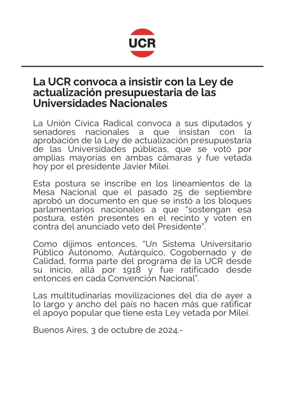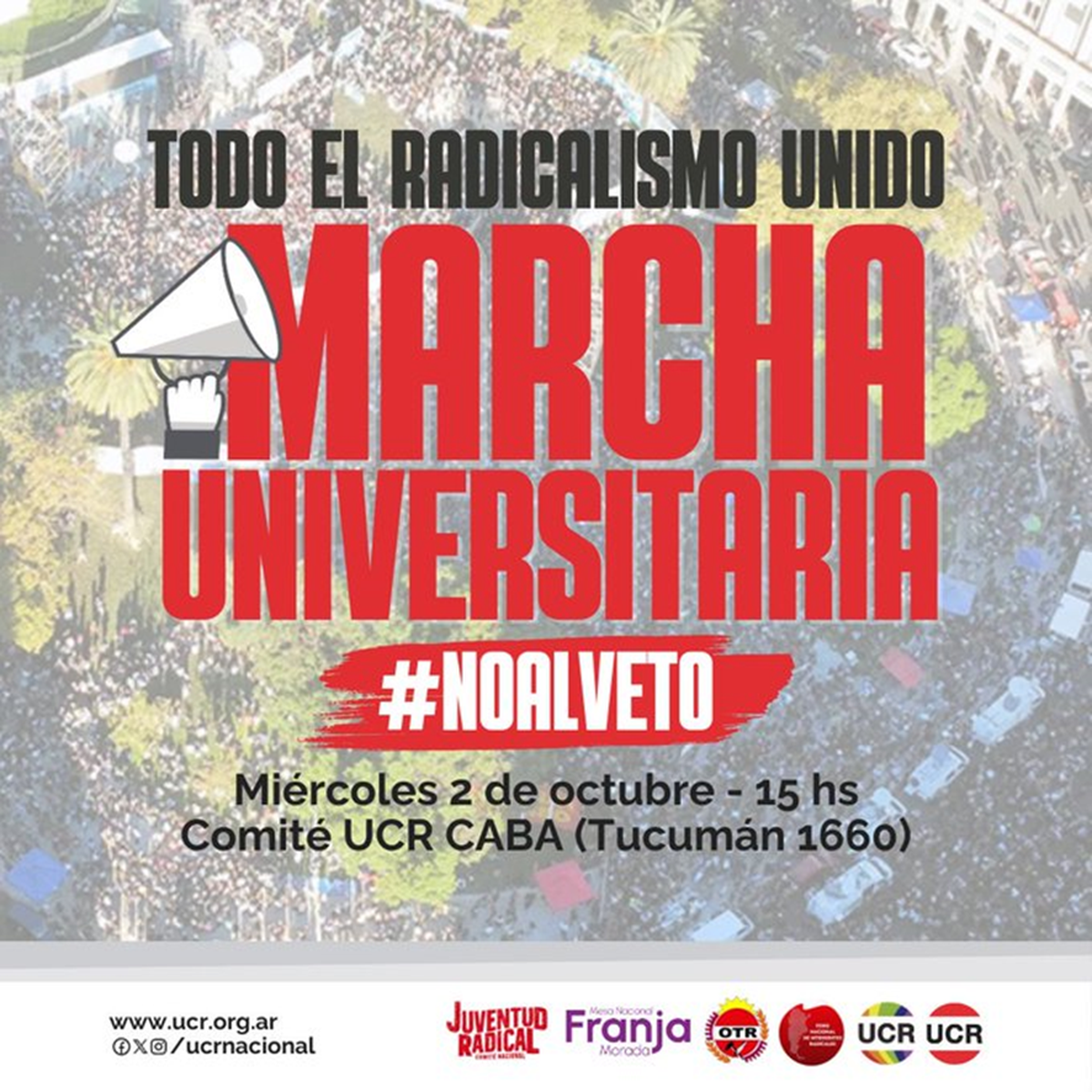 La Mesa Nacional de la UCR tomó decisión de unificar criterios sobre el presupuesto para las universidades. Se tratará el veto en diputados el miércoles 9/10.