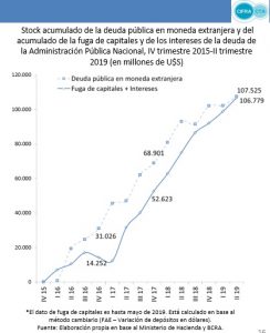 Un dato puntual que precisa CIFRA es que el volumen de la imponente deuda en moneda extranjera generada durante el gobierno de Cambiemos “es prácticamente igual a los dólares que se fueron por la fuga de capitales y los intereses de la deuda en su gestión: la deuda pública en moneda extranjera creció en U$D 107.525 millones entre diciembre de 2015 y junio de 2019 en tanto que la fuga de capitales y los intereses lo hicieron en U$D 106.779 millones en el mismo período”, es decir el 99,3% del endeudamiento contraído en el mismo lapso.