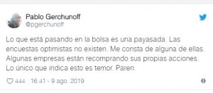 Según esa historia oficial, Alberto y Cristina vencerían por 1,5%. De inmediato se apreció un levísimo descenso del dólar y del Riesgo País y un más perceptible aumento de las acciones del Merval. El economista radical Pablo Gerchunoff, que integró los gabinetes de Raúl Alfonsín y Fernando de la Rúa, dijo que no había tal encuesta y que lo que estaba sucediendo era una payasada.