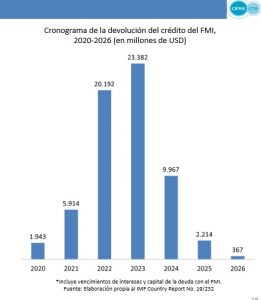 «Según las estimaciones del Fondo, los vencimientos de capital e intereses ascienden a U$D 34.744 millones en lo que resta del año, de los cuales U$D 23.061 millones son con el sector privado y organismos internacionales de crédito. El FMI proyecta que los vencimientos para los primeros dos años del próximo gobierno alcanzan a U$D 79.552 en 2020 y a U$D 84.407 millones en 2021, de los cuales más de U$D 50.000 millones en cada año son con el sector privado y organismos internacionales. Se trata de una verdadera pesada herencia».