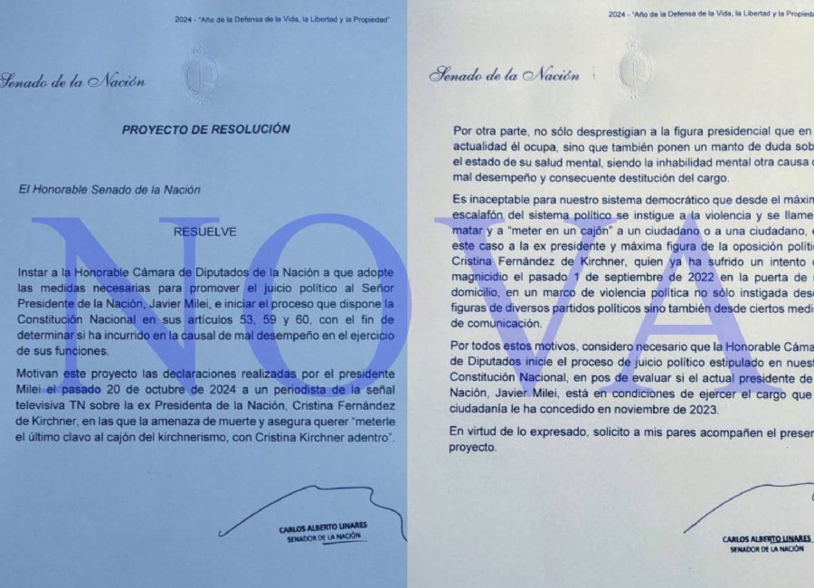El senador Carlos Linares presentó un pedido de juicio político contra el presidente Javier Milei por «mal desempeño de sus funciones» debido a sus violentas declaraciones sobre la expresidente Cristina Kirchner.