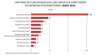 Durante el primer año del gobierno de Milei, el Observatorio de las Elites había detectado también múltiples conflictos de intereses, protagonizados por funcionarios con participación en sociedades anónimas y directorios de empresas a las que deben controlar; además de los mencionados casos e funcionarios que vienen de (y probablemente vuelvan a) los sectores a los que deben regular desde el Estado; pasando por el elefante en la sala: el asesor monotributista Santiago Caputo, que ni siquiera está nombrado y no es auditable. El informe había detectado 55 los funcionarios de rango superior –ministerios, secretarías y subsecretarías– que tienen 182 participaciones declaradas ante la Inspección General de Justicia en directorios de sociedades anónimas, sociedades de responsabilidad limitada y sociedades extranjeras, entre otras. El Ministerio en el que más casos aparecieron fue el de Economía (23 funcionarios), seguido por la Jefatura de Gabinete (7 funcionarios) y la primera edición del Ministerio del Interior (5 funcionarios).