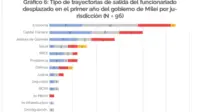 En ese contexto, y advirtiendo la dificultad persistente de analizar los gabinetes libertarios debido a la altísima rotación de sus integrantes –de hecho, Lisandro Catalán fue el ministro del Interior que menos duró en el cargo: solo 47 días–, el informe analizó las trayectorias previas y posteriores de 96 funcionarios que renunciaron o fueron echados desde el inicio del gobierno y hasta diciembre de 2024. Según la investigación, la mayor rotación se concentró en áreas clave: el Ministerio de Economía tuvo 27 bajas (el 28 % del total), seguido por Capital Humano (20) y Jefatura de Gabinete (14).