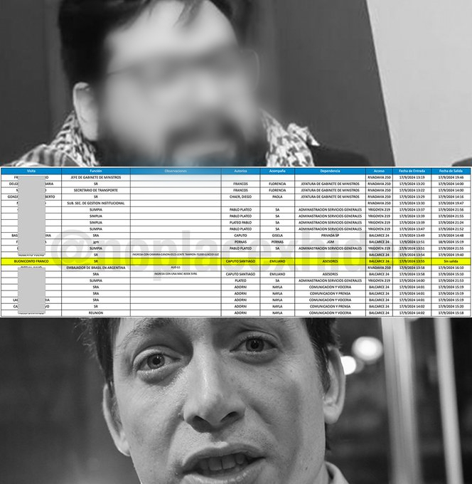 El que autorizó esa entrada, a las 13.55, fue Santiago Caputo. De acuerdo al mismo documento, el rosarino se dirigió en esa oportunidad directamente a la dependencia “Asesores”.