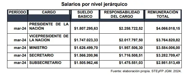 «La Secretaría de Transformación del Estado y Función Pública informa las remuneraciones correspondientes a los cargos de Autoridades Superiores del Poder Ejecutivo nacional y que los montos de las mismas mantienen los valores establecidos a diciembre de 2023, de conformidad con lo dispuesto en los Decretos N° 90/24 y N° 235/24″, indica la respuesta de Posse en el mencionado informe. Allí se observa que el presidente Javier Milei tiene un sueldo actual de $4.066.018, 15 y la vicepresidenta de la Nación, Victoria Villarruel, cobra un total de $3.764.820,82.