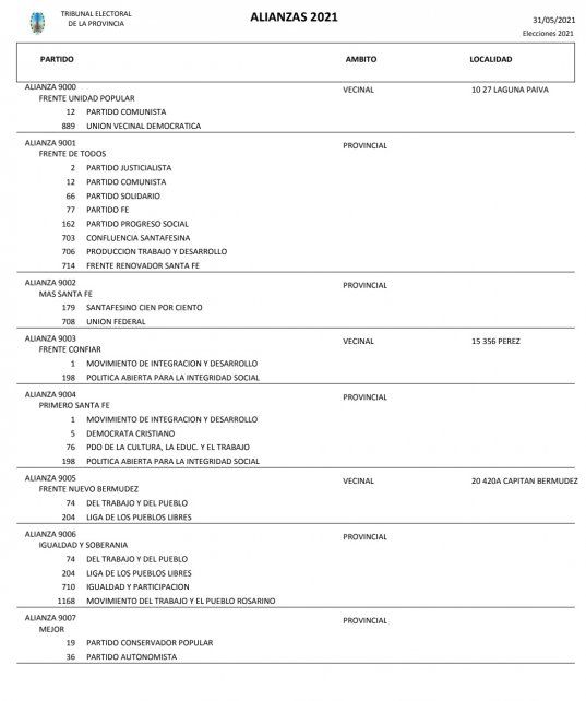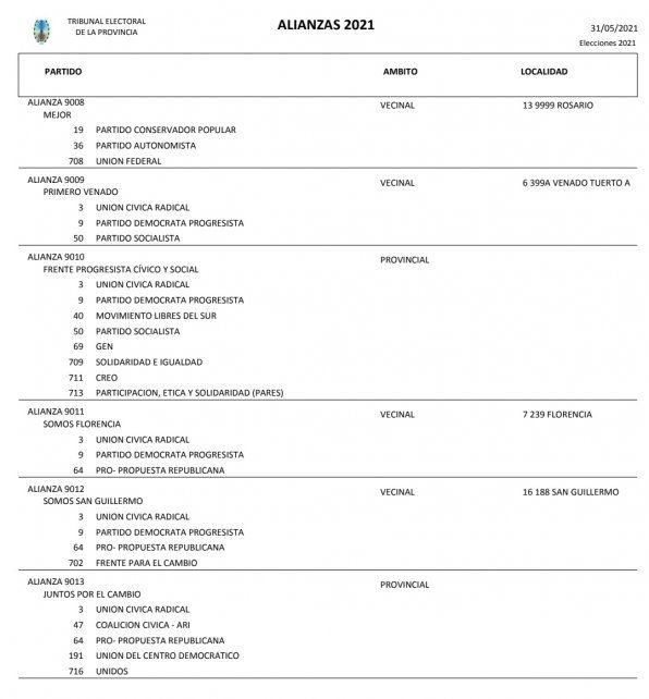 En ese marco, fueron anotadas las alianzas Frente de Todos (FdT), Frente Progresista Cívico y Social (FPCyS), Juntos por al Cambio (JxC), Primero Santa Fe, Más Santa Fe, Igualdad y Soberanía y Mejor.