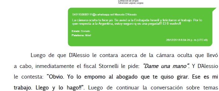 Sin embargo, lo que no pareció ser impreciso fue el material secuestrado durante el allanamiento en la casa de Marcelo D`Alessio en el Country Saint Thomas, en una de cuyas 47 bolsas fueron consignados dispositivos de espionaje importados de Israel. Las cámaras ocultas que D`Alessio dice haber corroborado con la Embajada de Israel (por las cuales habría recibido felicitaciones), el estudio de grabación montado en su casa para la digitalización de fake news, y su obsesión por el hallazgo de grupos terroristas de Hezbollah en la Triple Frontera, explican en demasía afinidades electivas en relación a la delegación diplomática israelí, y sus acólitos locales, Montoto, Yanco, Bullrich y Waldo Wolff. [4]