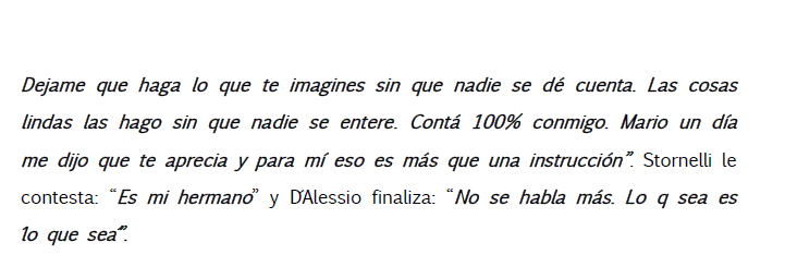 En una de las grabaciones que le hizo Etchebest, D’Alessio dice que trabaja para el ministerio de Seguridad gracias a Montoto, a quien llama uno de los hombres más poderosos del país, dueño de todas las cámaras de seguridad y socio de Hadad en el 50% de Infobae. Bullrich y Montoto lo negaron. Pero en las fojas 157 y 158 del procesamiento de D’Alessio, el juez Alejo Ramos Padilla consignó un diálogo más que significativo entre el agente de inteligencia y el fiscal Stornelli.