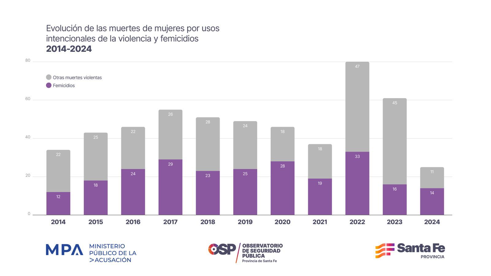 El Gobierno de Santa Fe presentó los datos oficiales de las muertes violentas de mujeres durante 2024. En este sentido informó que hubo una reducción interanual del 59 %, y se registró el segundo valor más bajo de femicidios de los últimos 10 años