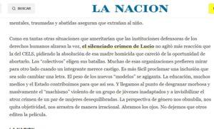 Pero La Nación introduce un sesgo ideologista, para lo cual no trepida en falsear los hechos. Dice el editorial: “El silenciado crimen de Lucio no agitó más reacción que la del CELS, pidiendo la absolución de esa madre homicida que careció de la oportunidad de abortarlo. Los ‘colectivos’ eligen sus batallas. Muchas de esas organizaciones prefieren mirar para otro lado cuando un integrante merece castigo. Es más fácil proclamar una inclusión que sea solo cambiar una letra. El peso de los nuevos ‘modelos’ se agiganta. La educación, muchos medios y el Estado contribuimos para que así sea. Y llegamos al punto de desgranar morbosa y masivamente el ‘machismo’ violento de un grupo de jóvenes inadaptados y a invisibilizar el atroz crimen de un par de mujeres desequilibradas. La perspectiva de género nos obnubila, nos quita objetividad, nos arrastra de manera irracional. Abramos los ojos. No dejemos que otros editen la película”.