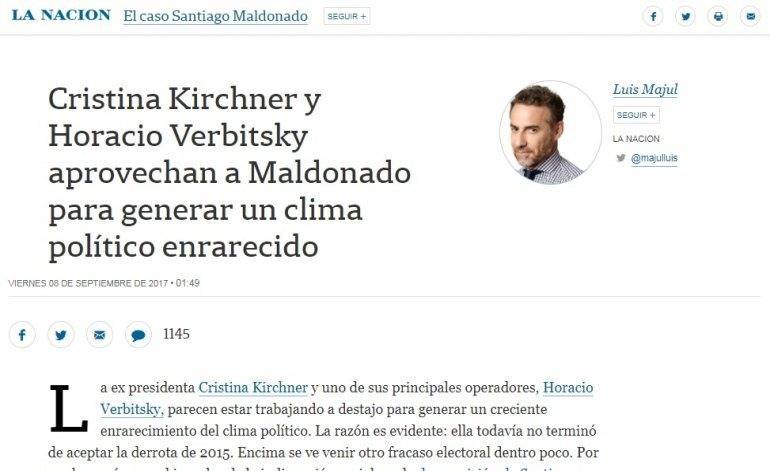 El periodista Luis Majul escribió una columna en el diario La Nación donde asegura que la ex presidenta Cristina Kirchner y el periodista Horacio Verbitsky «estar trabajando a destajo para generar un creciente enrarecimiento del clima político», en referencia a que se benefician con la desaparición de Santiago Maldonado.